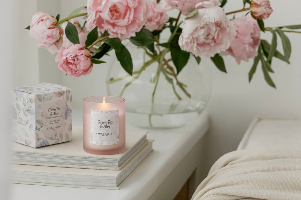 Φέρτε μια αίσθηση φρεσκάδας και φυσικής αρμονίας στον χώρο σας με το αρωματικό κερί Laura Ashley με άρωμα Green Tea & Aloe.
