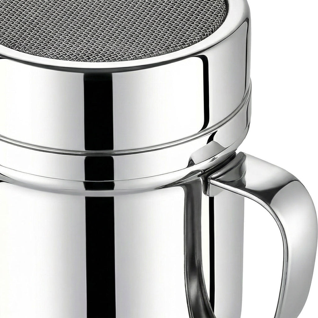 Δοχείο κοσκινίσματος ζάχαρης άχνης ανοξείδωτο με καπάκι πλαστικό 270ml.